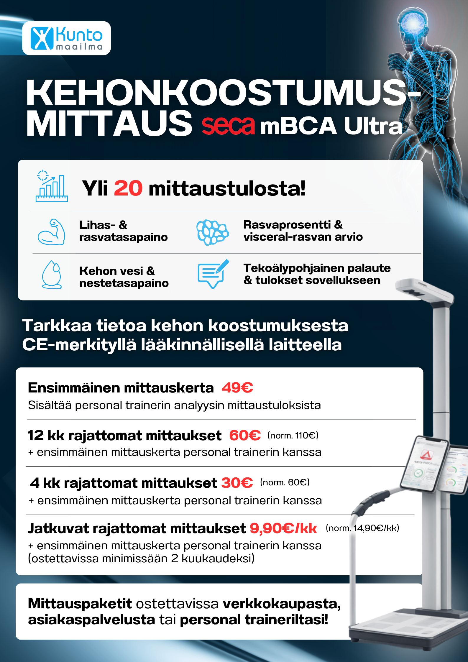 - 4kk rajattomat mittaukset 30€ ( + ensimmäinen mittaus personal trainerin kanssa)