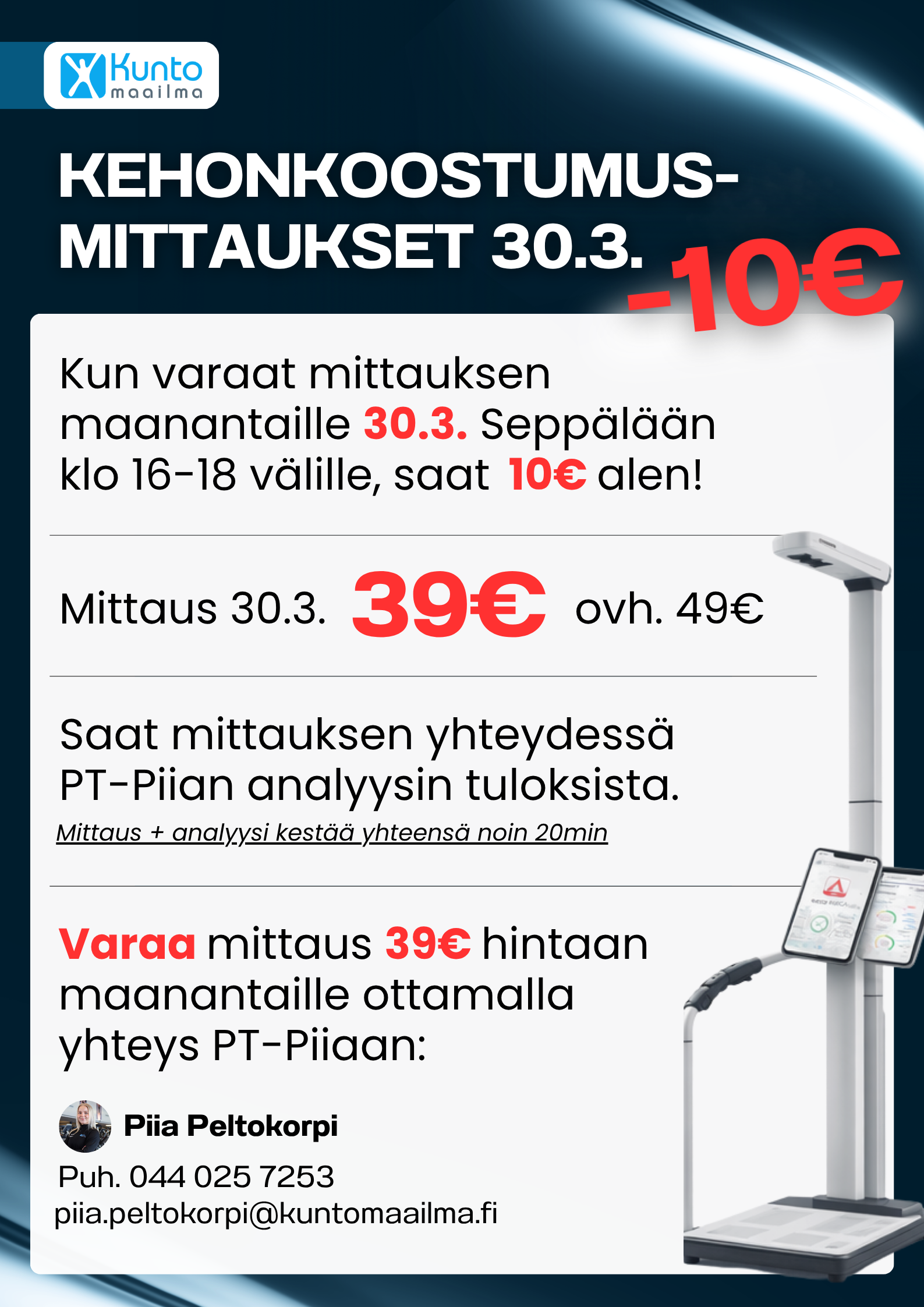 Varaa mittaus 39€ hintaan maanantaille ottamalla yhteys PT-Piiaan: